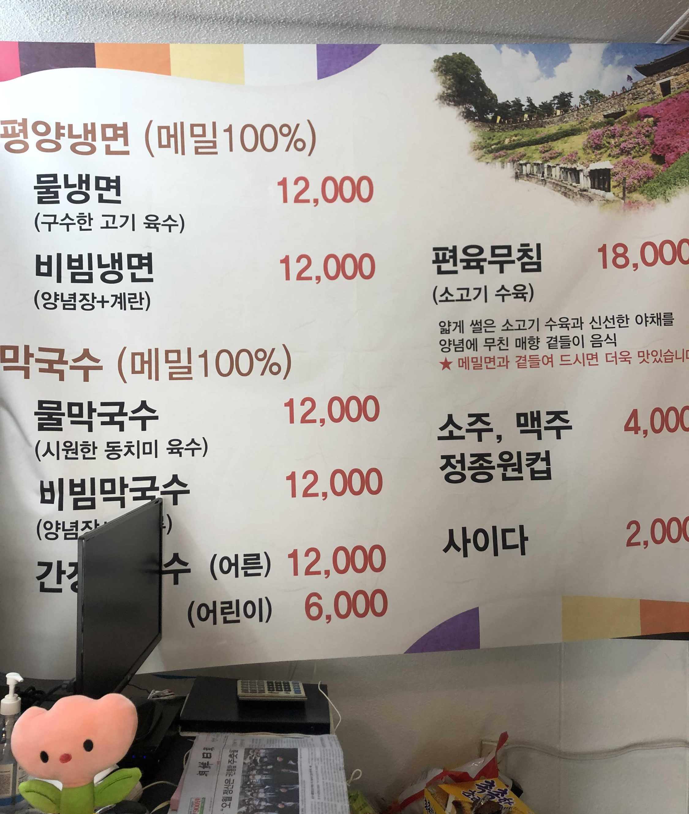 평양냉면과 막국수 12000원입니다. 물가가 많이 오르긴 했습니다. 비빔막국수 하나와 편육 무침을 주문했습니다. 식당에 들어서면서 주문을 하고 선결재를 합니다. 그러면 테이블 번호를 안내해 줍니다. 테이블 번호가 가려져 있어 당황했었네요.